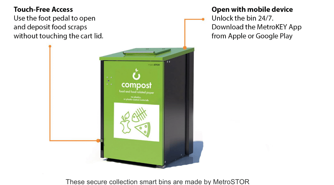 3.) Bring your food scraps to the bin, open it with your cell phone, and deposit the scraps.